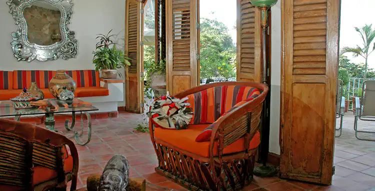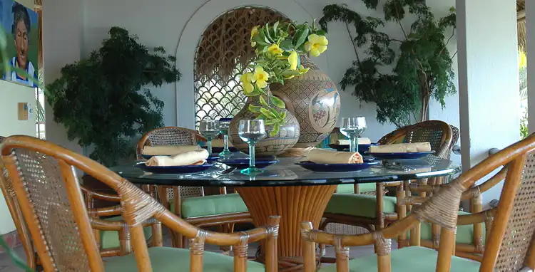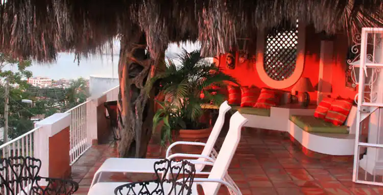 It boasts a terrace that spans the width of the villa and has a palapa covered bar. It is a great entertaining space that could host an event or wedding for up to thirty people. The Palapa has the largest dining room in the villa and can seat a group of ten. It has excellent views of old town Puerto Vallarta.